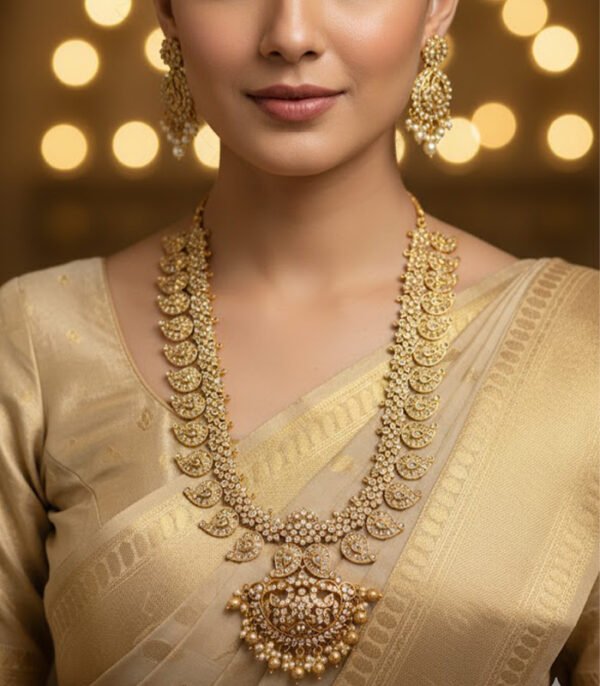 A grand, gold-tone long necklace featuring continuous paisley/leaf links set with sparkling white stones (Kundan/Polki style), a large oval pendant, and gold bead drops.