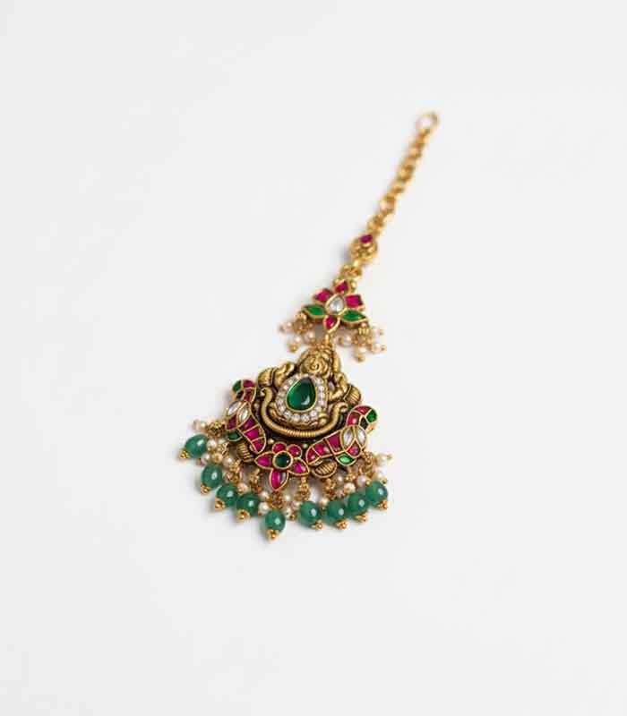 An antique gold-finish Maang Tikka featuring a central emerald-green stone surrounded by intricate work and highlighted with vibrant pink/ruby-colored stones, small clear stones, and multiple dangling green beads and pearls.
