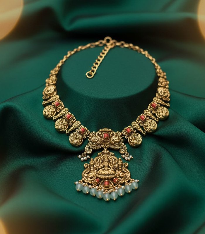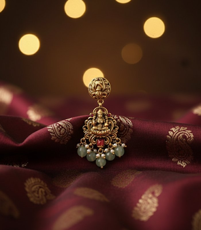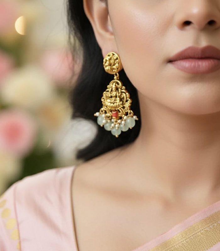 An elegant antique gold-tone drop earring featuring a highly detailed Goddess Laxmi or temple motif, accented with a red stone, and embellished with hanging pale green beads and small simulated pearls.