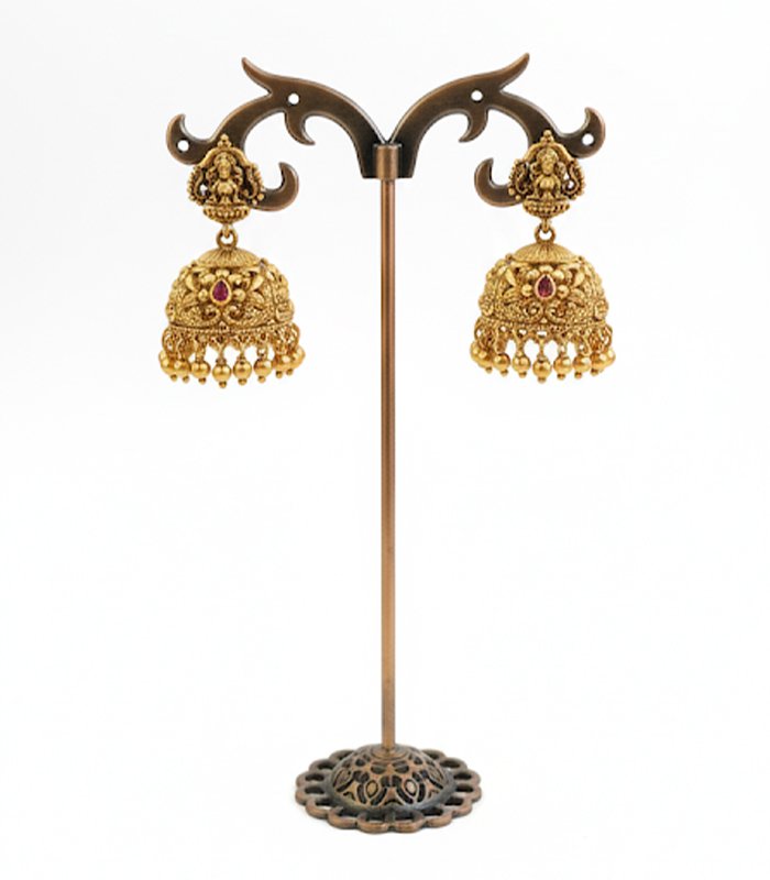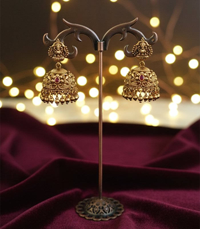 A traditional pair of Jhumka earrings with a rich antique gold finish. The stud features the goddess Lakshmi, and the highly detailed bells are embellished with intricate sculpting, a small ruby-red stone accent, and a fringe of gold bead drops.