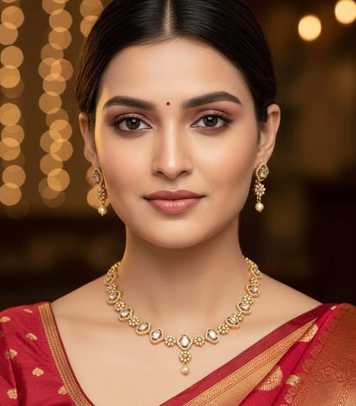 Elegant Kundan necklace set with matching pearl drop earrings. Perfect for weddings and festive occasions, adding timeless beauty and royal charm.