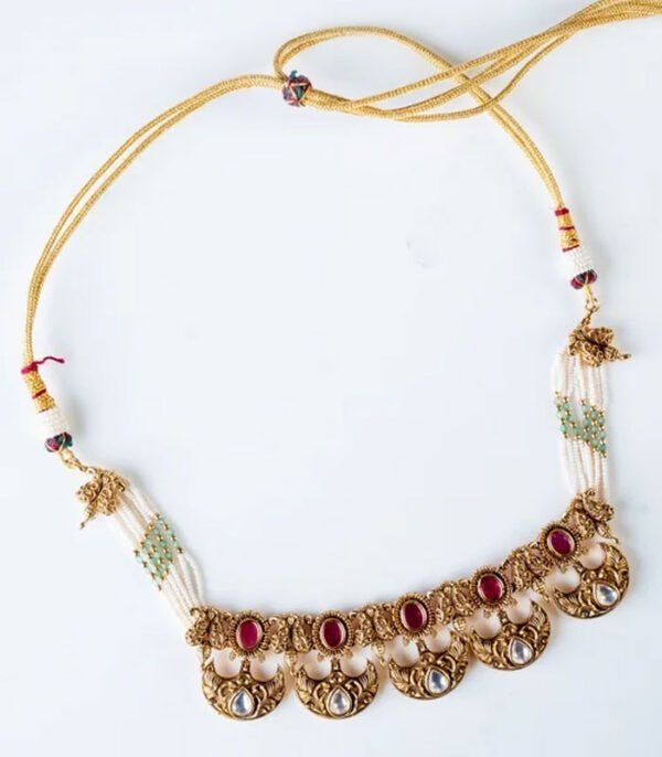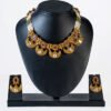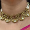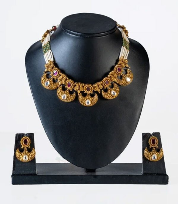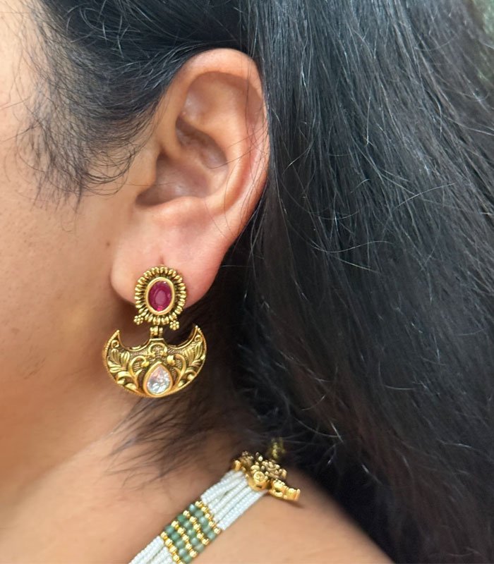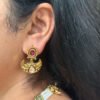 Gold Temple jewellery inspired motif with Kundans on pendent and earrings.