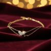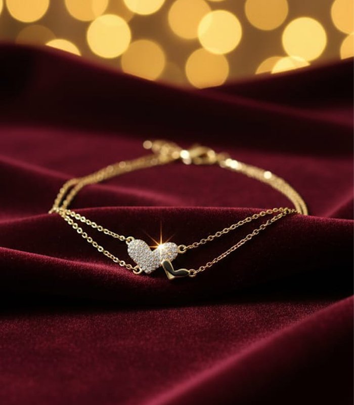 A delicate, layered gold-tone bracelet featuring a sparkling pave heart charm and a simple, elegant second chain. Romantic design.