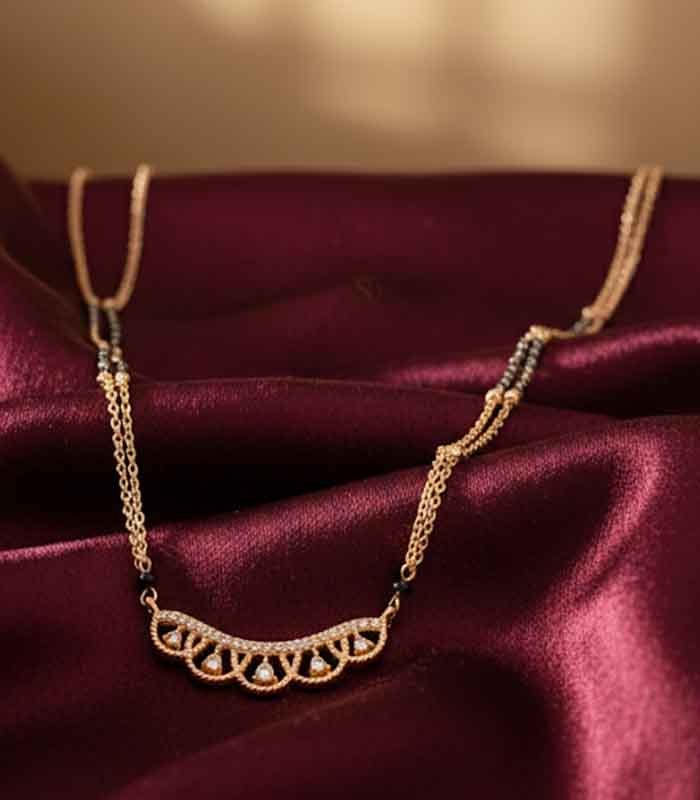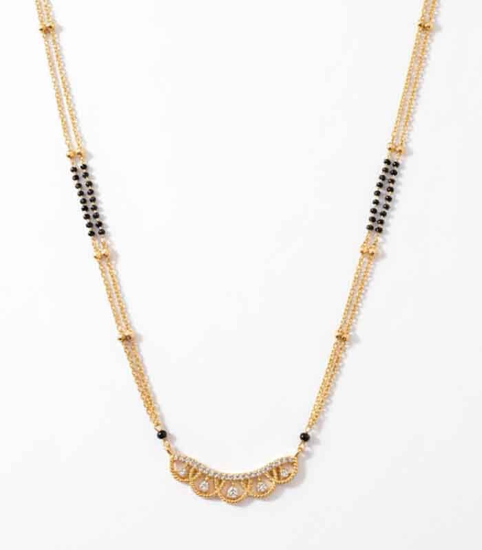 This exquisite piece offers a sophisticated and subtle interpretation of the traditional Mangalsutra. It is designed with an elegant long length, making it perfect for layering or wearing over traditional Indian attire. The chain is a beautiful double-layered design, featuring the auspicious black beads (nallapusalu) strategically placed in sections, giving it a classic look. The central focus is the delicate, minimalist pendant, which forms a gentle arc or scallop shape. This pendant is finely detailed with gold-toned filigree and subtly embellished with sparkling Cubic Zirconia (CZ) or American Diamonds (AD), adding just the right amount of shimmer. Its lightweight design makes it an excellent choice for daily wear while retaining the deep symbolic meaning of the necklace.