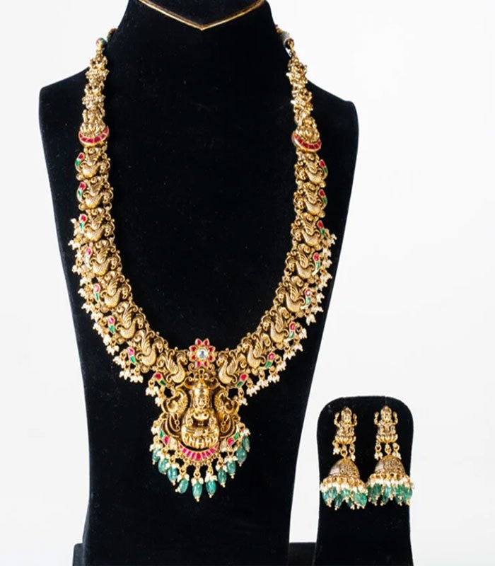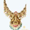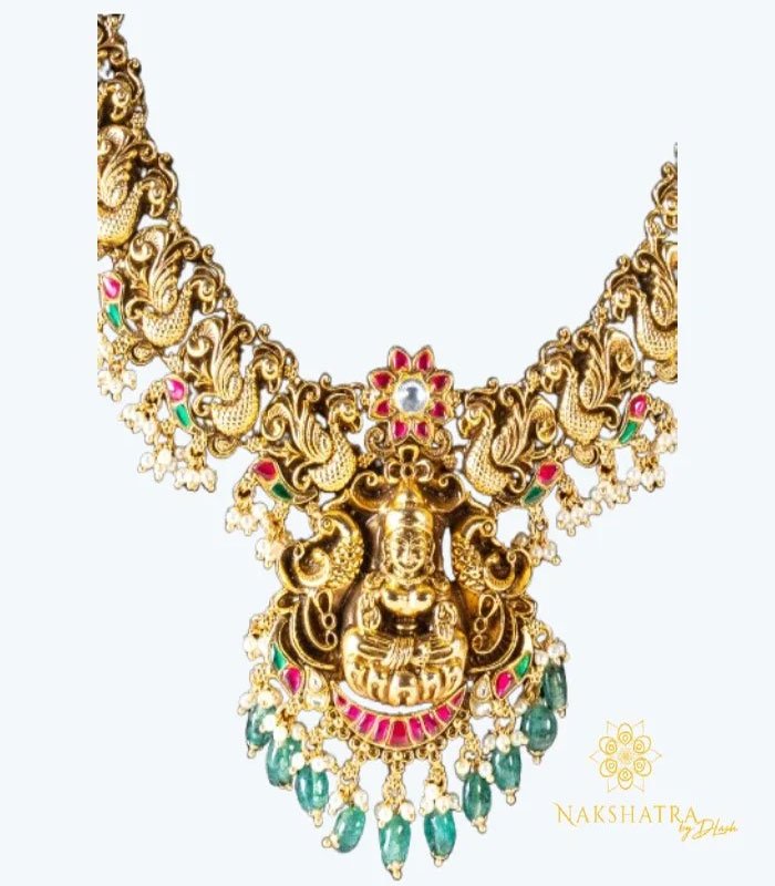 - This majestic temple necklace set showcases divine craftsmanship with an intricately carved Goddess Lakshmi pendant, surrounded by rows of peacocks and floral motifs in antique gold.