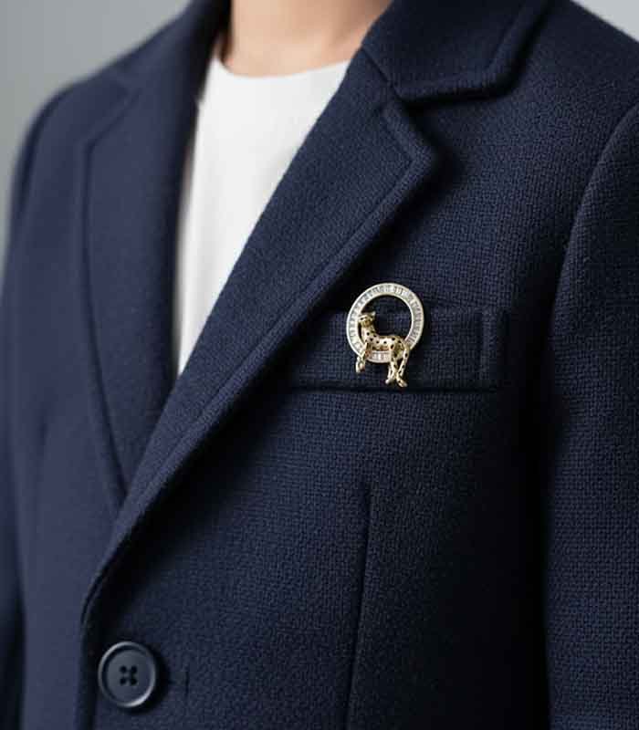 This elegant and eye-catching brooch captures the fierce beauty of a wild cat. The central element is a finely detailed leopard or cheetah, crafted in gold-tone metal with contrasting black enamel spots that give it a realistic texture. The animal stands gracefully within a perfect circular frame, which is completely encrusted with a single row of clear, brilliant baguette-cut stones, providing a magnificent sparkle and a sense of luxury. The combination of the smooth gold-tone finish, the stark black spots, and the geometric brilliance of the stones makes this piece a sophisticated statement accessory. It is an ideal piece for adorning a lapel, scarf, or dress, and is presented here on a rich, deep red velvet fabric, suggesting an opulent and timeless style.