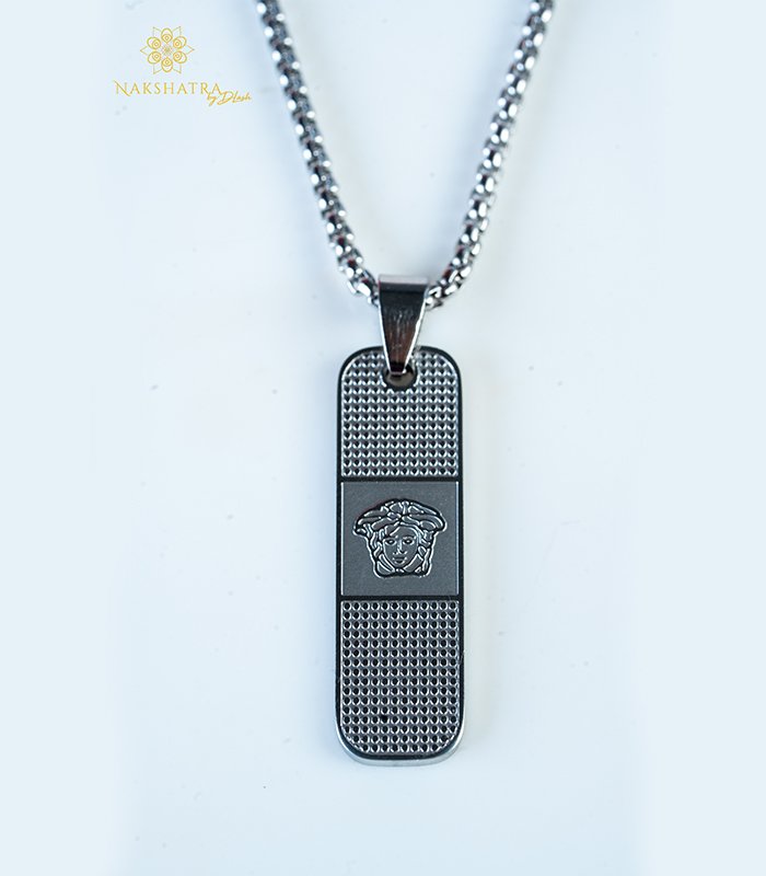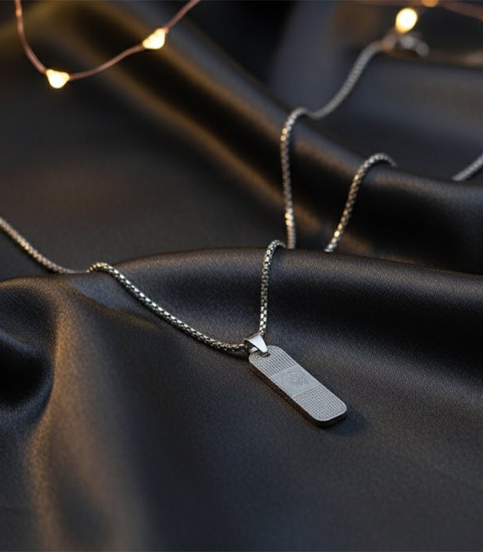 A sleek men’s necklace featuring a silver-tone dog tag pendant with a textured, micro-gridded border and a central crest/emblem. The pendant is suspended from a long, smooth silver-tone box chain (or Venetian chain).