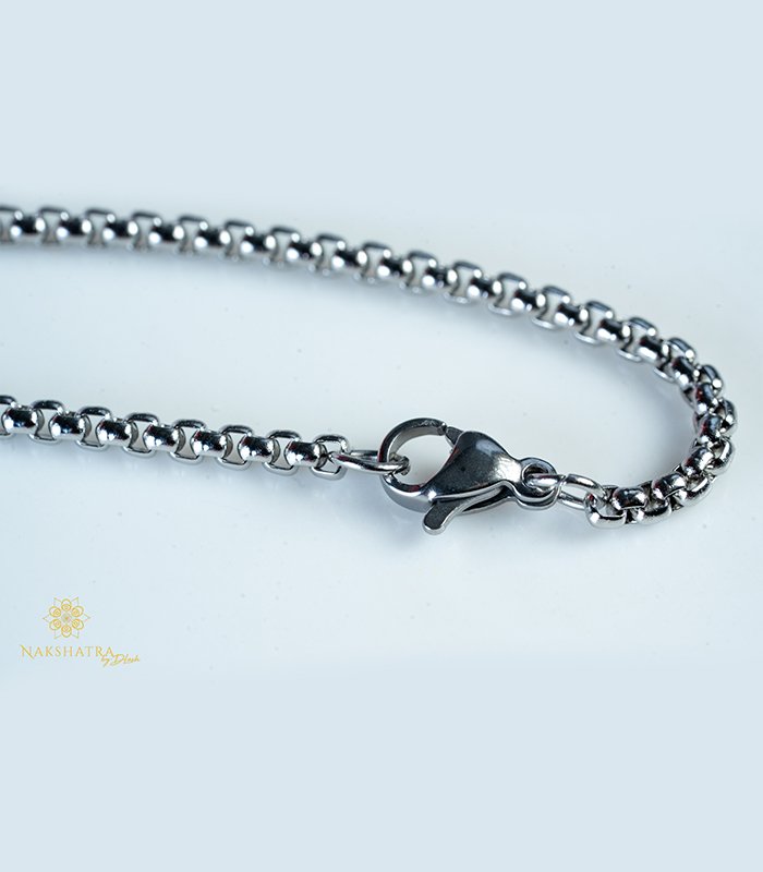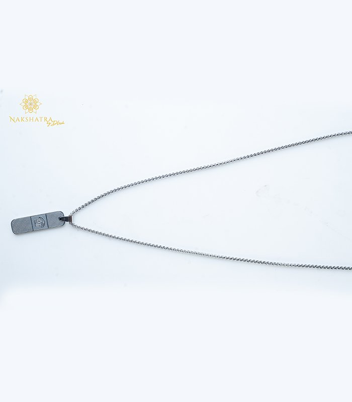 This contemporary men’s chain combines a rugged design with modern styling. The necklace uses a durable, long box chain (also known as a Venetian chain), characterized by its small, square, interlocking links, which provides a fluid drape and a clean, minimalist look.