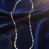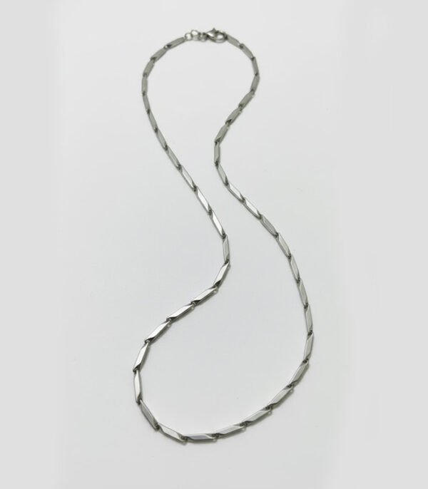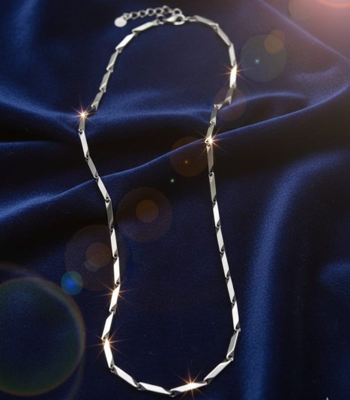 It is beautifully showcased on a plush deep blue velvet backdrop, where the rich fabric highlights the movement and contrasting colors of the links. The chain is secured with a clean, discrete clasp. With its linear, geometric shape and dual-tone versatility, this piece is an excellent choice for those seeking a modern, high-fashion statement that is both clean and eye-catching.