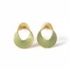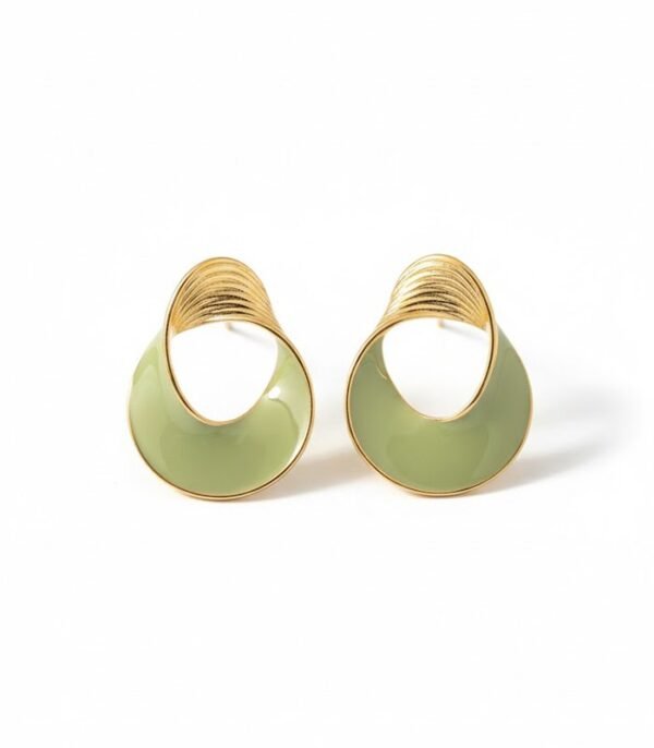These fashionable earrings offer a striking blend of modern design and soft color. The shape is a stylized, looping form, reminiscent of a curved, open hoop or a twisted ribbon. The lower, broad curve of the design is finished with a smooth, polished application of sage green or light olive enamel, providing a soothing pop of color.