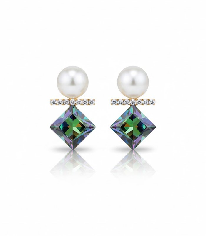 The main focal point is the large, dazzling gemstone suspended below the crystal bar. This stone has a striking square or cushion cut with checkerboard facets and exhibits a dramatic, color-changing effect, characteristic of Mystic Topaz or a specially coated crystal. The stone flashes with vibrant hues of deep green, purple, and blue as light hits its facets, creating a mesmerizing effect. The combination of the classic pearl, the sparkle of the accents, and the bold, multi-hued bottom stone makes these earrings a glamorous and unique accessory.