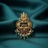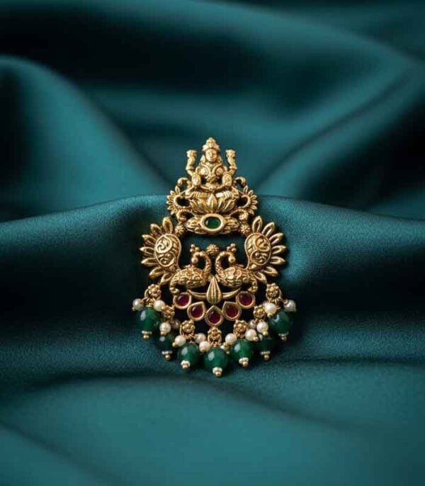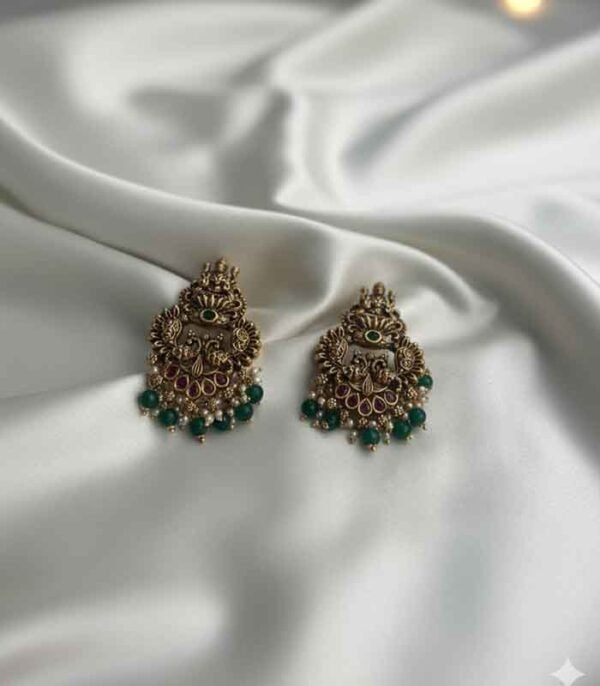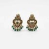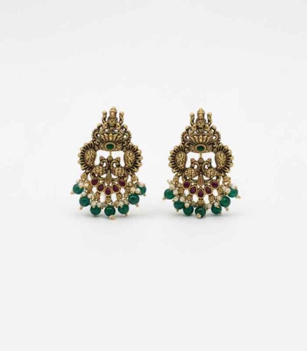 A pair of intricate, traditional Chandbali-style earrings with an antique gold finish. The design features the goddess Lakshmi, peacock motifs, accents of ruby-red and emerald-green stones, and a delicate fringe of green beads and small pearls.
