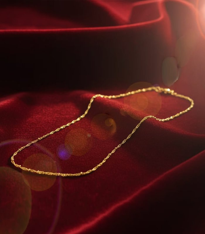 A delicate gold-tone Singapore chain featuring intricately twisted, diamond-cut links that create a fluid, shimmering aesthetic. Perfect for minimalist daily wear.