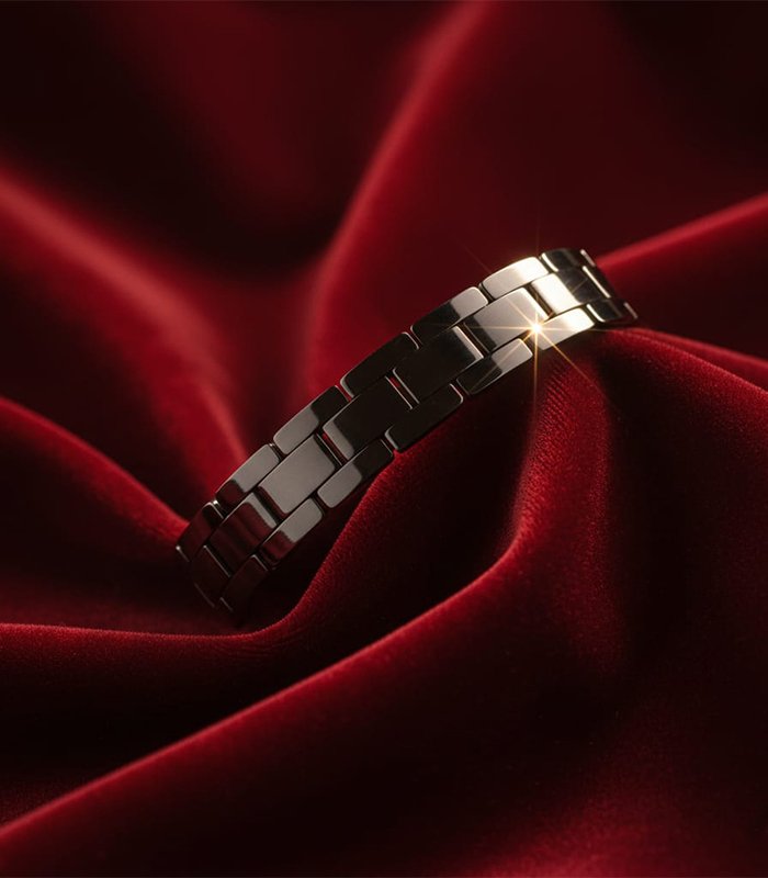 The bracelet is finished with a brilliant high-polish coating that catches the light across its flat surfaces, creating a dynamic metallic shimmer. Its streamlined and substantial profile makes it a powerful standalone accessory, perfect for those who appreciate industrial-inspired jewelry with a luxury feel. Crafted for durability and daily wear, this piece balances its bold visual weight with a smooth, ergonomic interior that rests easily against the skin. Whether worn as a signature daily staple or paired with other dark-tone accessories for a layered look, this link bracelet is an essential foundational piece for any modern jewelry collection.