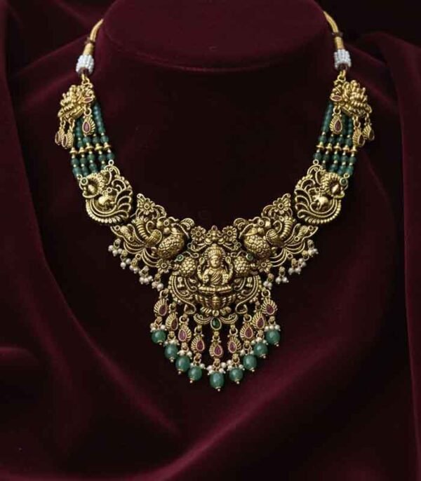 Gold Temple jewellery with Lakshmi motif on pendant and earrings. Premium finish suitable for ethnic and bridal wear.