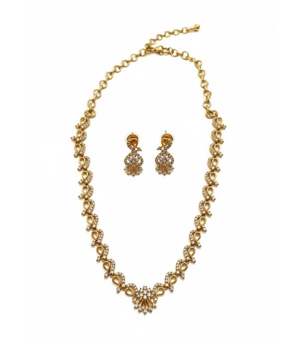 The Regal Infinity Sparkle Necklace Set is a perfect blend of classic elegance and modern charm. Designed with graceful infinity-inspired patterns, this necklace is beautifully highlighted with shimmering stone embellishments that create a luxurious and radiant appeal. The rich gold-tone finish enhances its royal look, making it a standout piece for any special occasion. The matching earrings mirror the intricate design of the necklace, completing the set with flawless symmetry and style.