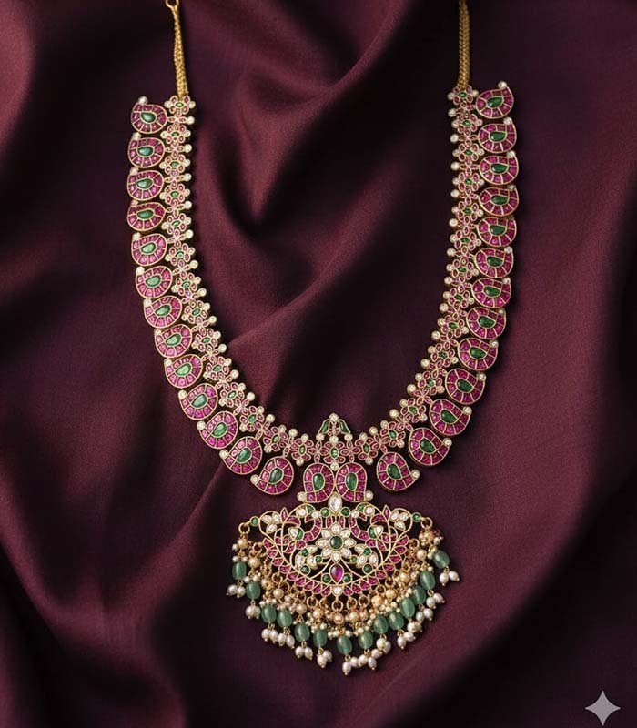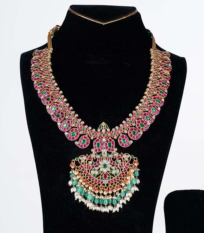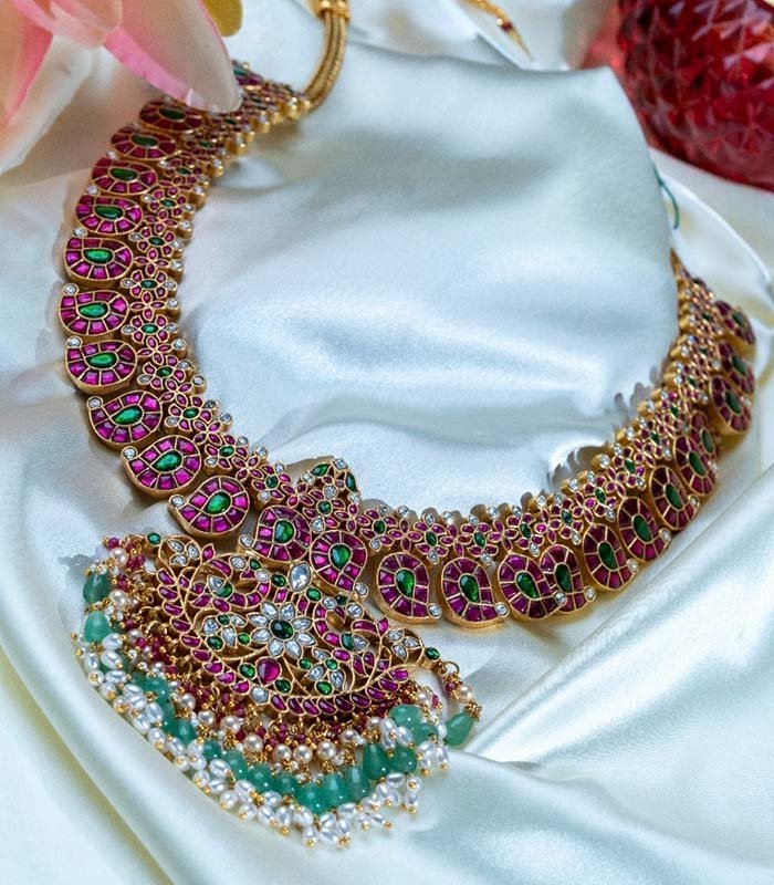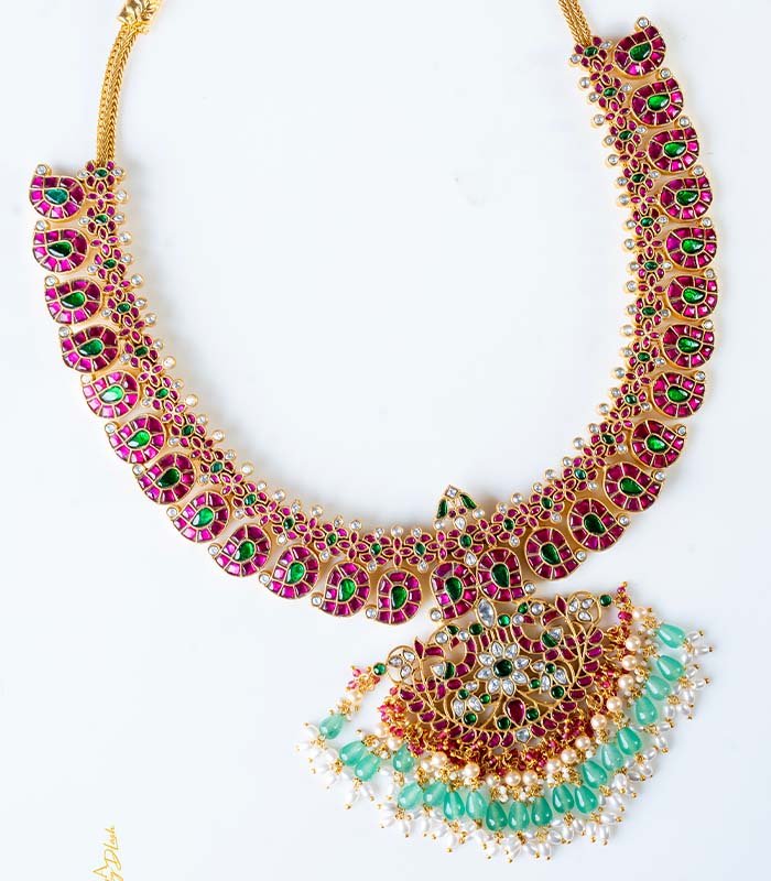 Make a majestic statement on your wedding day with this luxurious stone-studded necklace. The piece features a dramatic cascade of individual motifs, each finely set with high-quality deep-pink rubies and verdant emeralds. The design creates a graceful curve, making it sit beautifully on the neckline. The true centerpiece is the elaborate Kundal or temple-style pendant, which features a harmonious blend of the same colored stones, interspersed with tiny CZ stones for added sparkle, and finished with elegant clusters of small pearls and green bead drops. This heavy, traditional necklace is ideal for layering with a shorter choker or serving as the main focus of a grand bridal ensemble.