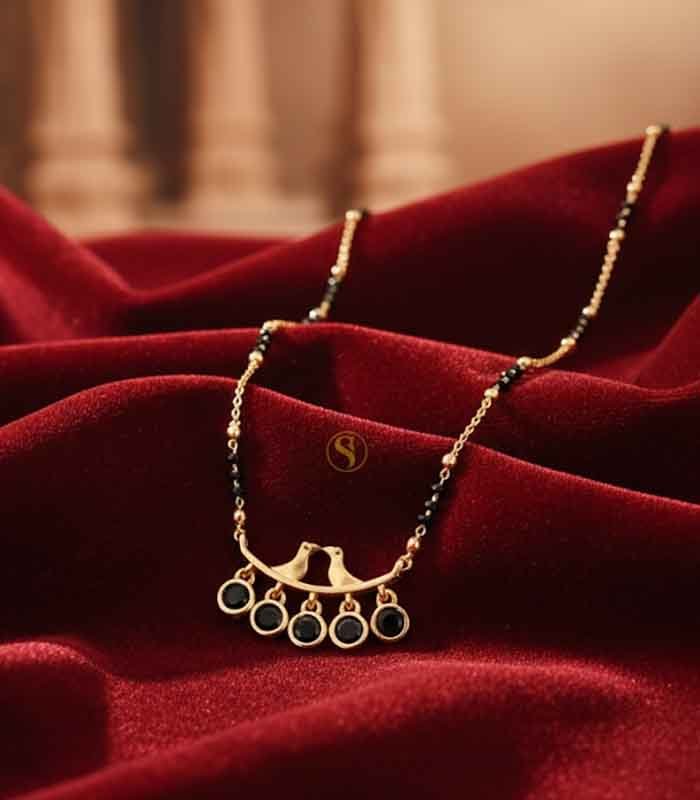 Celebrate your bond with this uniquely designed Mangalsutra, which beautifully symbolizes companionship and marital love with its central Love Birds motif. The necklace features a delicate, short-length chain that alternates between classic gold-tone beads and the auspicious black beads (nallapusalu). The minimalist pendant bar showcases two stylized birds perched together, symbolizing the couple. Dangling below the bar are five striking black round stones (possibly onyx or black crystal), which provide a modern and eye-catching contrast to the gold finish. This piece is perfect for the bride who prefers a meaningful, modern design over traditional stonework, making it ideal for daily wear or pairing with contemporary outfits.