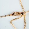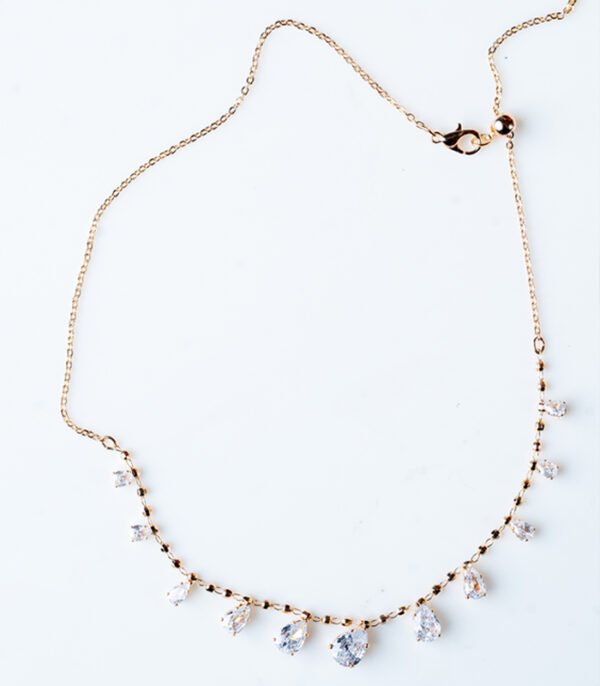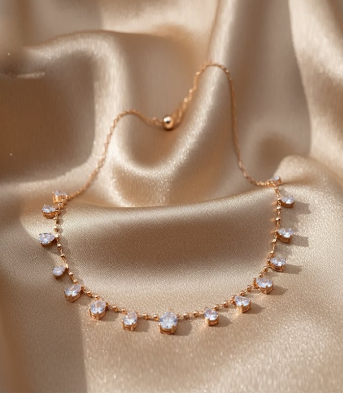 A delicate women’s choker or necklace featuring a rose gold-tone chain interspersed with small, brilliant-cut clear stones set in alternating heart-shaped and round bezels.