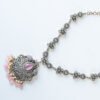 A touch of royal charm with this dazzling necklace set, adorned with a pink teardrop centerpiece and intricate antique finish detailing.