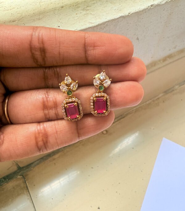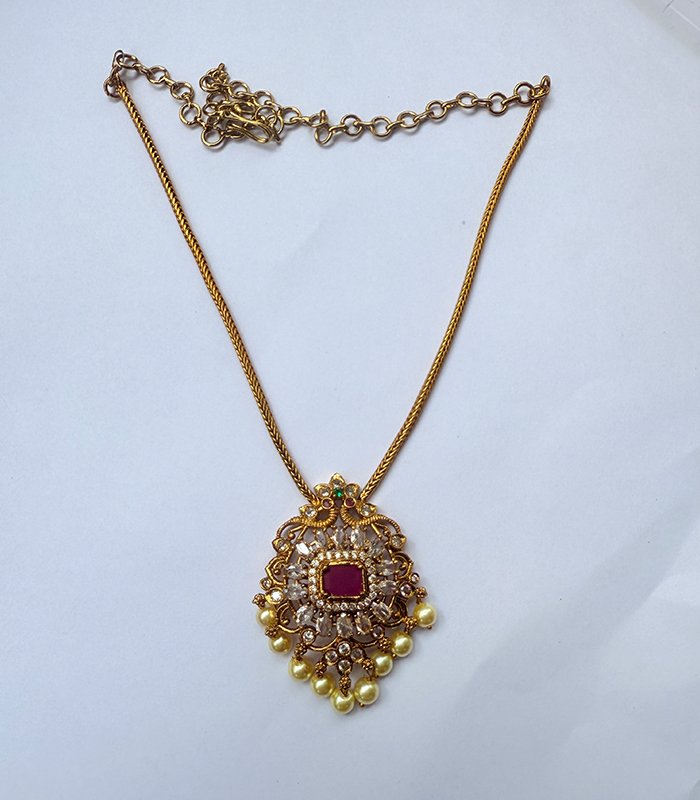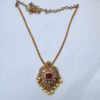This elegant ruby stone gold-plated necklace set exudes timeless charm with its stunning ruby centerpiece, sparkling white stones, and graceful pearl drops. Paired with matching earrings, it’s the perfect choice for weddings, festive occasions, and evening celebrations, adding a royal touch to your ensemble.