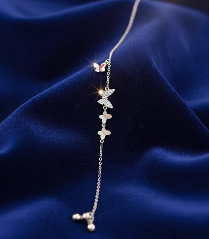 Adding to the whimsical nature are two smaller, polished silver-tone butterflies and a series of polished beads along the chain. The bracelet is designed for a perfect fit, featuring a secure lobster clasp and an adjustable extender chain, finished with a delightful dangling ball charm.