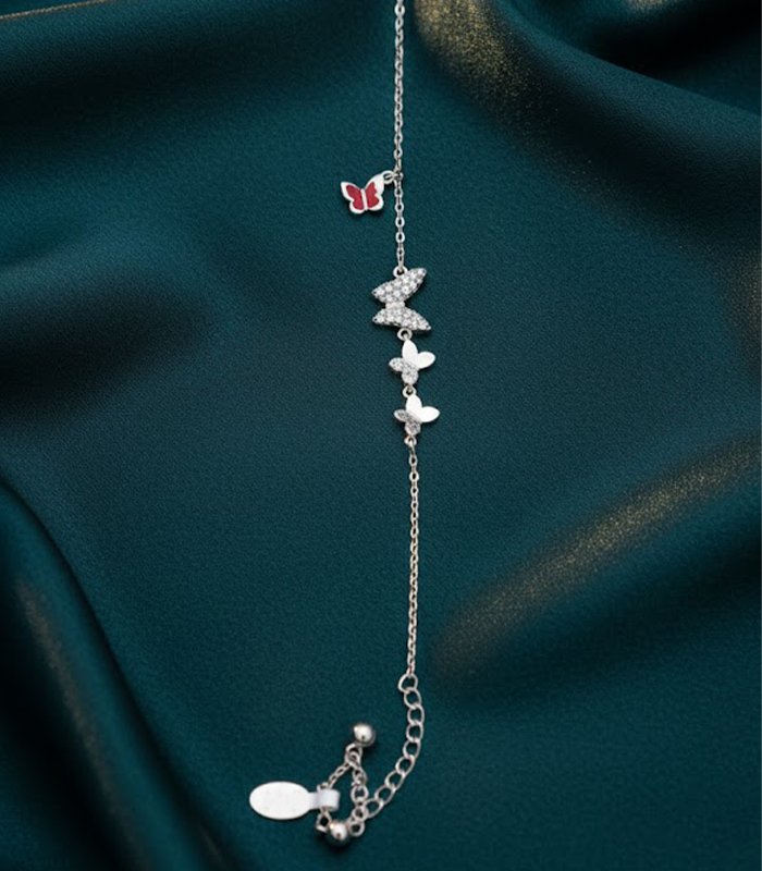 Introducing the Silver-Tone Red Enamel and Pave Butterfly Charm Bracelet, a piece that beautifully blends vibrant color with delicate sparkle. This charming bracelet features an array of enchanting butterfly charms suspended along a fine silver-tone chain. The focal points include a striking butterfly finished in bright red enamel for a bold pop of color, and a brilliant counterpart fully paved with glittering simulated diamonds (or cubic zirconia).