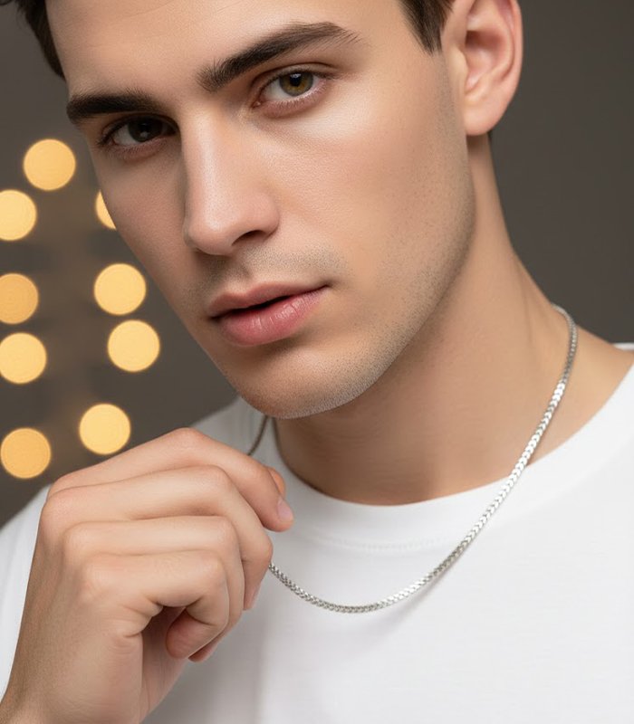 The chain is dramatically presented on a rich, deep crimson velvet backdrop, where the plush texture and bold color enhance the chain’s metallic simplicity and dark tone. Finished with a discrete clasp, this necklace is the perfect choice for those who favor minimalist and edgy jewelry. It can be worn solo for a refined look or layered with bright pieces to create a powerful, contrasting statement.
