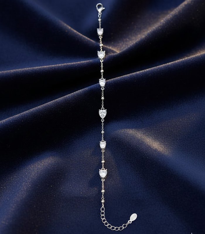 Introducing the Sparkling Feline Charm Bracelet, a delicate and enchanting piece that captures the playful elegance of a cat. This stunning silver-toned chain features seven exquisitely cut cubic zirconia stones, each faceted to resemble an adorable cat’s face with distinct ears, ensuring maximum brilliance and sparkle with every movement.
