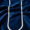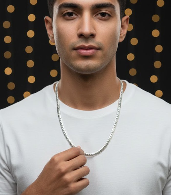 Draped across a plush royal blue velvet backdrop, the coolness of the silver metal contrasts elegantly with the luxurious depth of the fabric. The composition is further enhanced by the warm, blurred string lights in the background, suggesting a celebratory or premium context. Secured with a classic clasp, this chain delivers high-impact style, blending contemporary boldness with a sense of enduring quality.