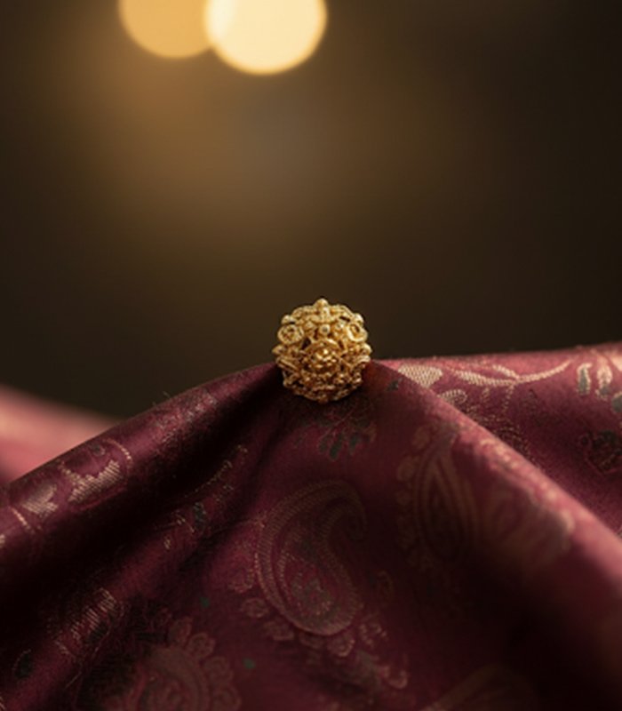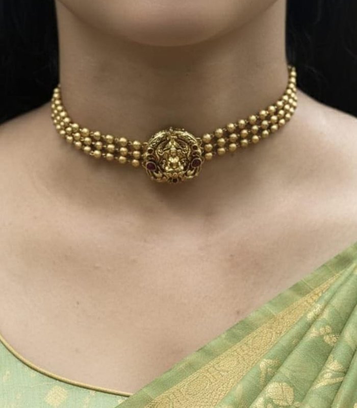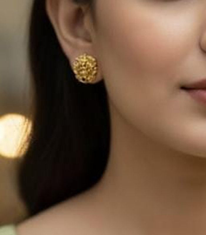 These simple yet bold choker and stud earrings offer a distinct, handcrafted look. They are round and completely covered in a deeply textured, irregular pattern, which mimics the organic surface of a gold nugget, coral, or hammered metal. This surface detailing maximizes light reflection, giving the earrings a substantial and expensive appearance, even in a small size.