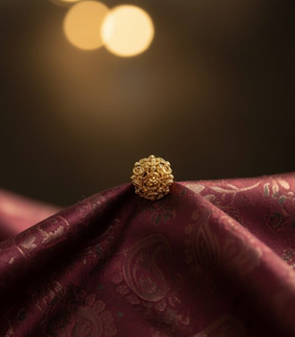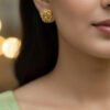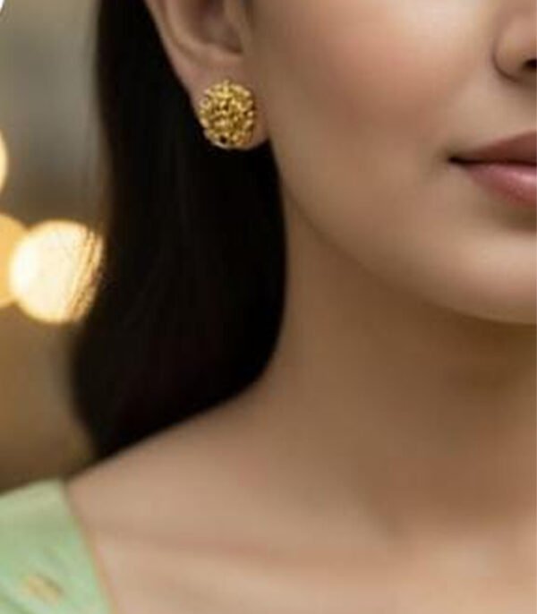 These simple yet bold choker and stud earrings  offer a distinct, handcrafted look. They are round and completely covered in a deeply textured, irregular pattern, which mimics the organic surface of a gold nugget, coral, or hammered metal. This surface detailing maximizes light reflection, giving the earrings a substantial and expensive appearance, even in a small size.