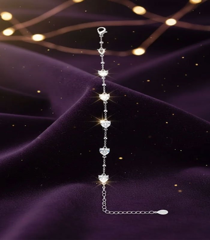 The heart stations are linked by both the main chain and a secondary, thinner chain adorned with tiny silver beads, adding a subtle texture and dimension to the overall design. The bracelet features a classic lobster clasp and a generous extension chain, allowing you to customize the length for a perfect, comfortable drape on your wrist. This versatile accessory is ideal for adding a touch of romantic shimmer to everyday outfits or for complementing a formal look. The Eternal Hearts Bracelet makes a perfect, heartfelt gift for anniversaries, birthdays, or as a loving gesture, symbolizing enduring affection and feminine grace.