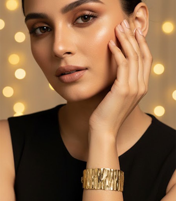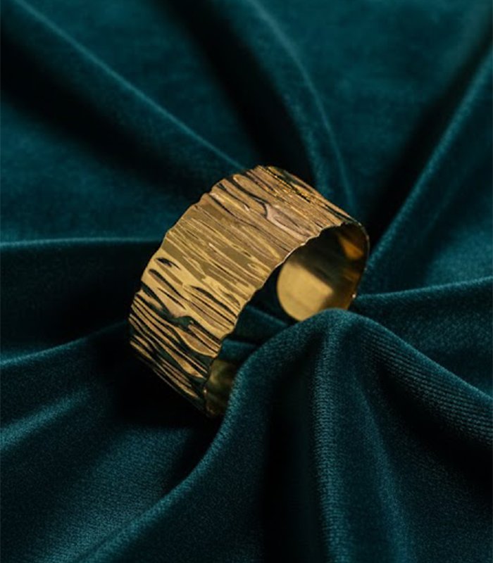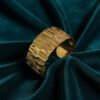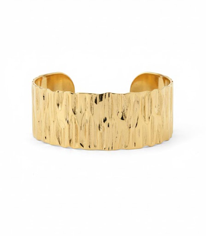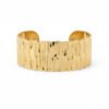 Finished in a vibrant yellow gold, this wide-profile cuff serves as a powerful statement piece. Despite its bold presence, the open-back design allows for a slight adjustment, ensuring it sits comfortably and securely on your wrist. Whether styled over the sleeve of a minimalist knit or paired with a flowing bohemian maxi dress, this cuff adds a layer of earthy sophistication to any look. It is the ultimate accessory for the woman who values artisanal luxury and wants a piece that feels both grounded and glamourous. Let this cuff be the bold, textured anchor of your jewelry collection.