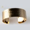 A striking gold cuff featuring a multi-band design and a sharp chevron pattern of square Mother of Pearl inlays. Perfect for a bold, modern, and artistic look.