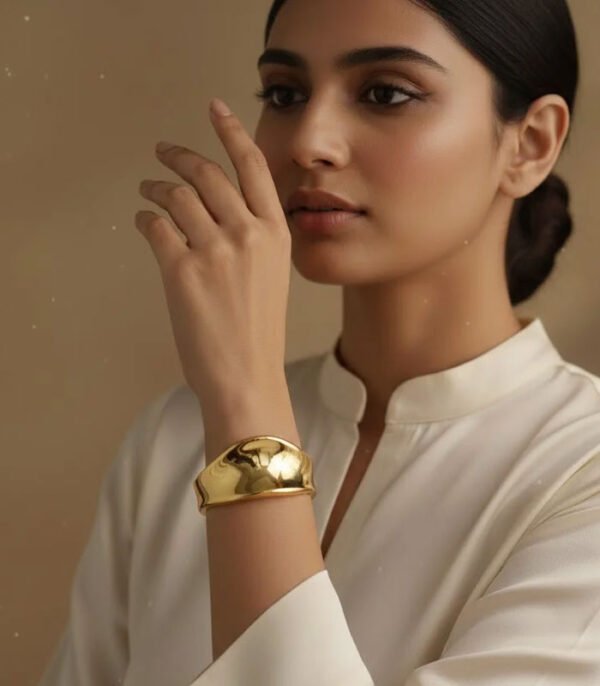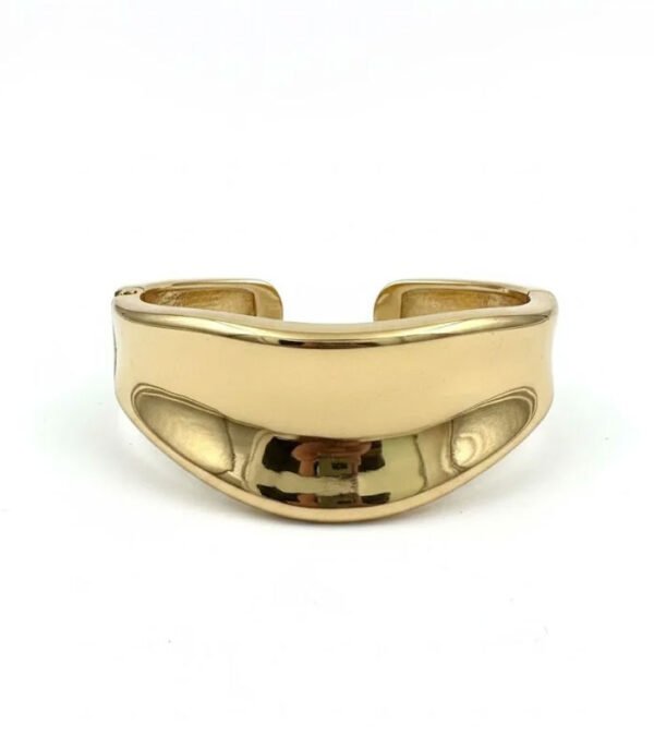 A bold, sculptural gold cuff featuring a unique inverted crescent shape and a flawless high-polish finish. Creates a dramatic, mirror-like reflection on the wrist.