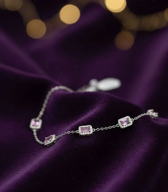 A delicate silver-toned bracelet featuring stunning emerald-cut pink stones, each framed by a sparkling micro-pave halo. Adds regal color and elegance to your wrist.