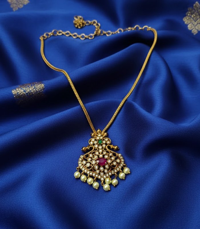This exquisite gold-plated temple pendant necklace showcases a handcrafted design with a ruby-red central stone, surrounded by sparkling white stones and pearl danglers. The intricate artistry and traditional motifs make it a perfect match for ethnic and bridal outfits, radiating elegance and cultural charm.