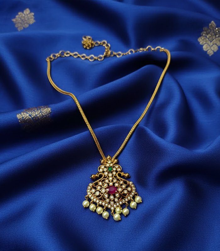 This exquisite gold-plated temple pendant necklace showcases a handcrafted design with a ruby-red central stone, surrounded by sparkling white stones and pearl danglers. The intricate artistry and traditional motifs make it a perfect match for ethnic and bridal outfits, radiating elegance and cultural charm.