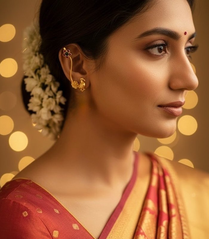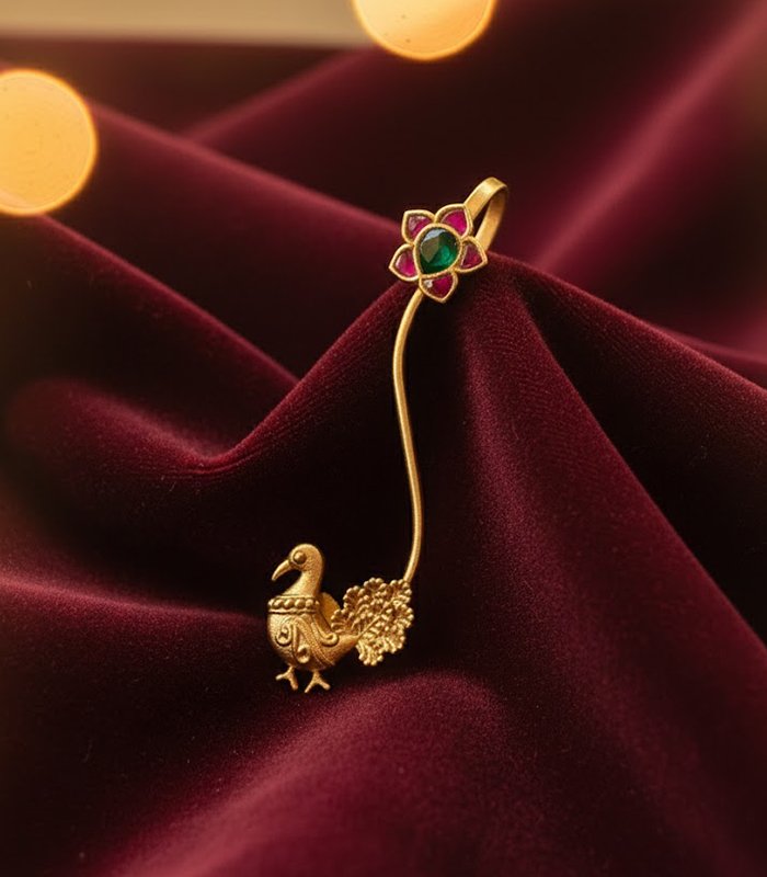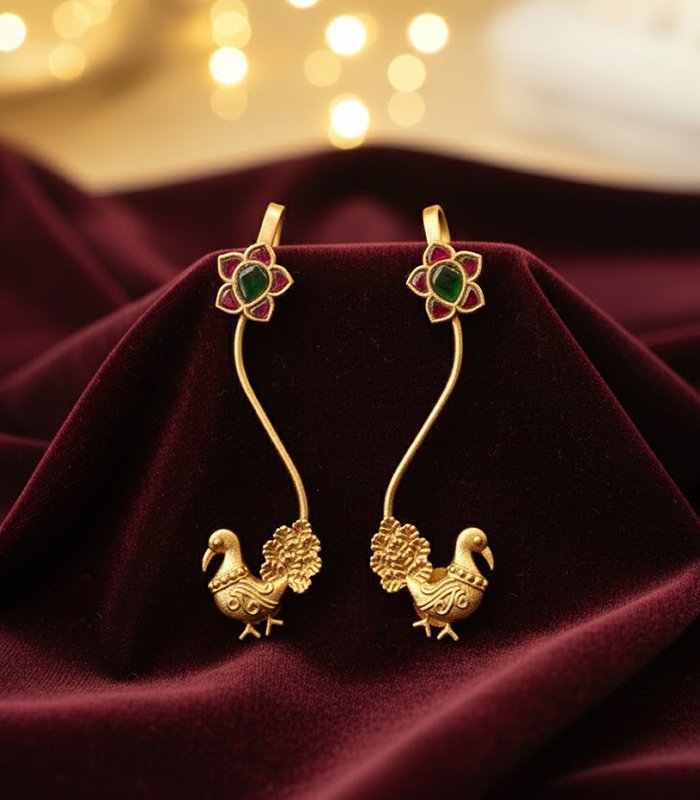 These stunning gold-plated earrings feature an elegant peacock design paired with a floral top embellished with red and green enamel detailing. Crafted with intricate artistry, they add a royal touch to ethnic and festive ensembles, making them perfect for weddings and traditional celebrations.