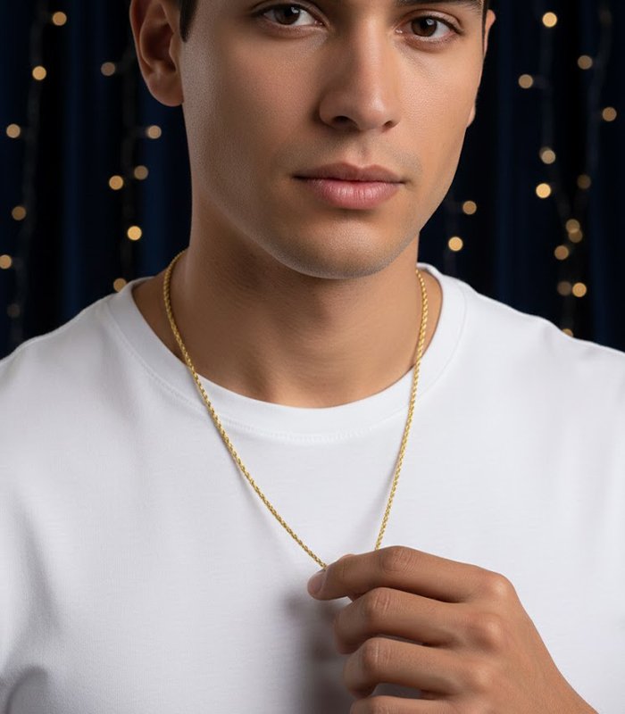 Presenting the Twisted Shine Gold Rope Chain, a beautiful necklace known for its intricate craftsmanship and radiant sparkle.