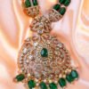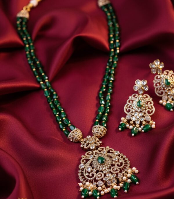 This jewelry set radiates royal charm and complements both traditional and contemporary outfits. The rich combination of green stones and pearl detailing adds a regal touch, making it a must-have for your collection.