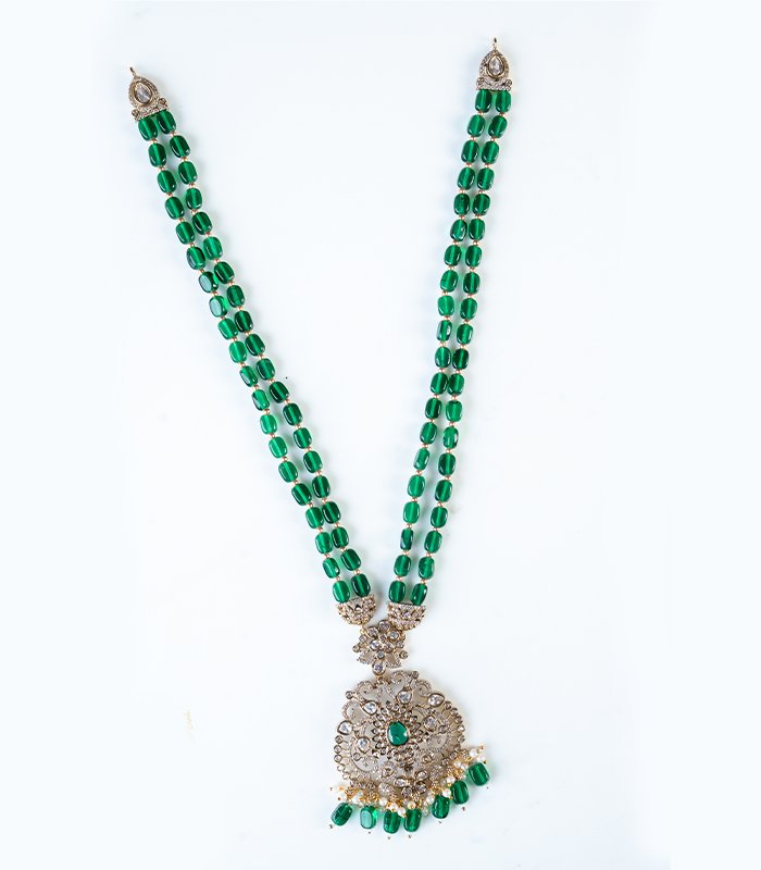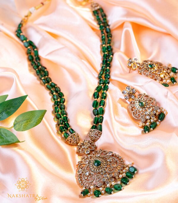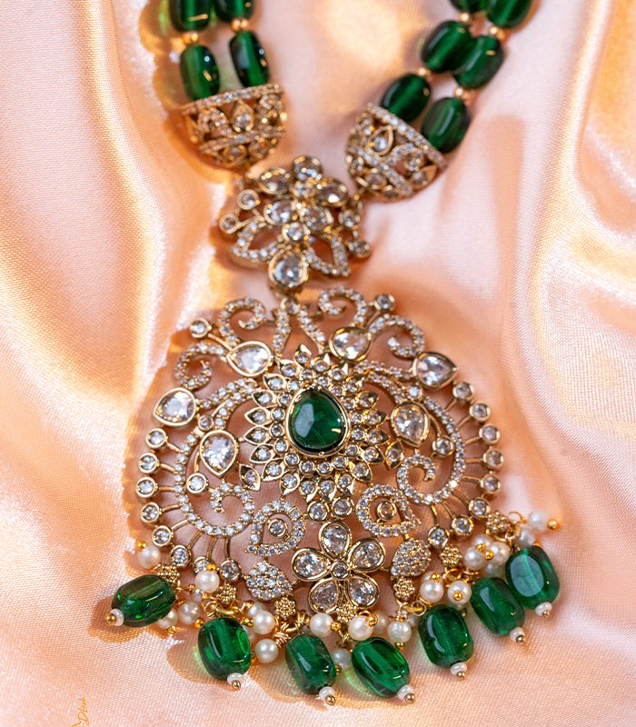 • Necklace: Dual-strand green beads with a stunning Victorian-inspired pendant.