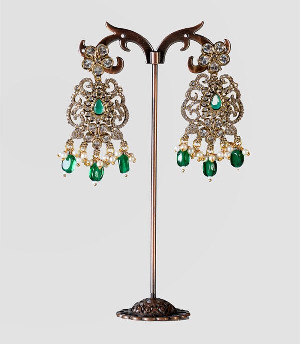 • Pendant Design: Intricate floral filigree encrusted with sparkling cubic zirconia, pearls, and emerald-green stones.