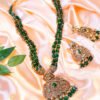Elevate your elegance with this exquisite Victorian jewelry set featuring a dual-layer green bead necklace paired with intricately crafted earrings. Adorned with sparkling cubic zirconia, pearls, and emerald-green stones, this set is perfect for weddings, festive occasions, or evening celebrations.