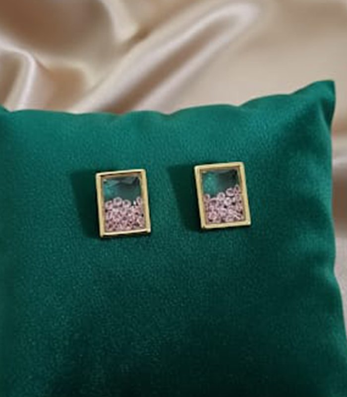 Unique gold-tone stud earrings in a miniature rectangular or square frame, featuring tiny pink floral elements or confetti suspended within a clear, crystal-like setting.